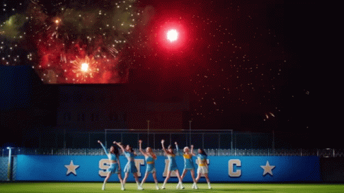 K-pop group Stayc performs their song 'Stereotype' with a dazzling fireworks display and a heart-shaped firework.