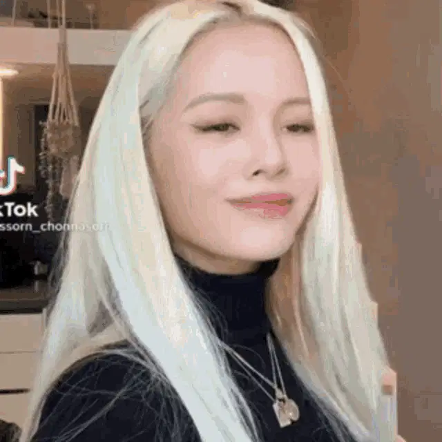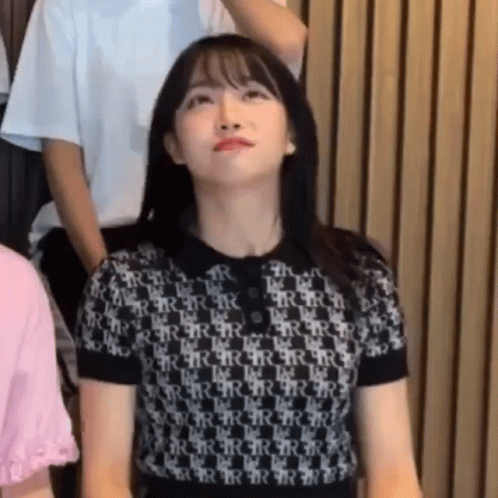 Stayc's Sumin, wearing a black and white patterned polo shirt, looks up with a pensive or slightly annoyed expression.