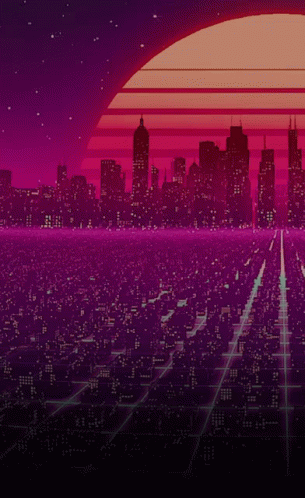 A vibrant retro-futuristic cityscape bathed in the glow of a large, stylized sunset with purple and pink hues.