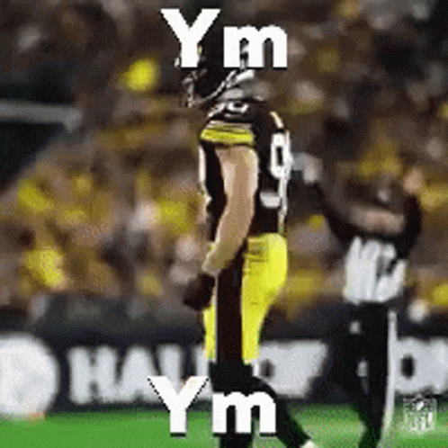 Pittsburgh Steelers player T.J. Watt (number 90) celebrates on the field with 'Ym' text overlay.
