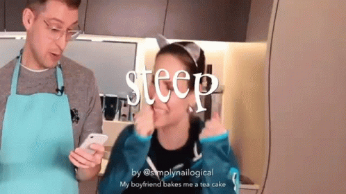 Cristine Raquel Rotenberg (Simply Nailogical) dances in the kitchen with 'steep' text, while her boyfriend bakes.