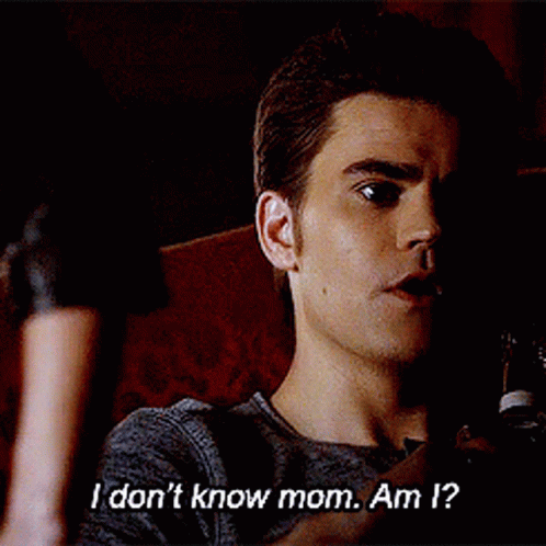 Stefan reacts with surprise, asking 'I don't know mom. Am I?' while sitting in a chair.