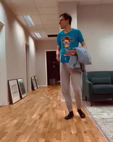 Stefan Marcinek looking confused and gesturing in a hallway, holding a jacket.