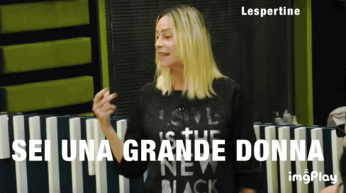 Stefania Orlando speaks, wearing a black shirt, with the caption 'Sei una grande donna' displayed.