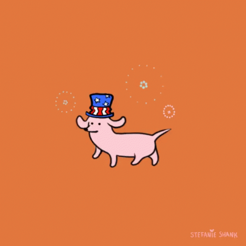 Stefanies Hank, a cute dachshund, wears an Uncle Sam hat, celebrating the 4th of July with sparkling animations.