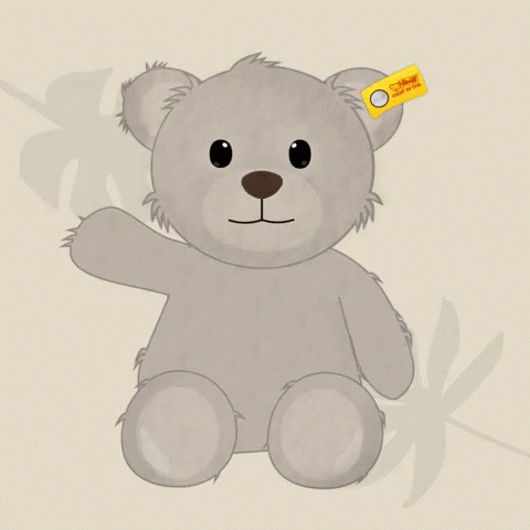 A friendly Steiff Honey Teddybear, light grey with a yellow ear tag, waves hello.