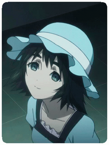 Mayuri Shiina from Steins Gate, wearing a blue hat and shirt, looks up and smiles.