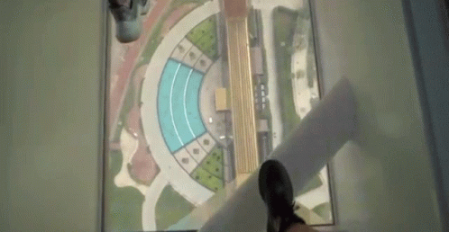 Жанна Радова прогуливается по стеклянному полу, наслаждаясь видом на городские сады и архитектуру.