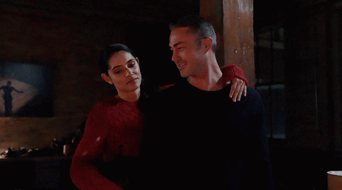 Kelly Severide (Taylor Kinney) and Stella Kidd (Miranda Rae Mayo) share a tender hug in a romantic Stellaride moment from Chicago Fire.