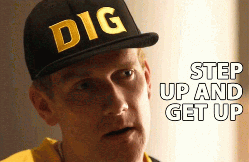 Michael Prindiville, wearing a 'DIG' hat, delivers a motivational message: 'Step Up And Get Up'.
