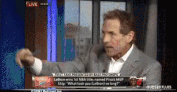 Stephen A. Smith sips from a cup during a segment on First Take, reacting to LeBron James's first NBA title.