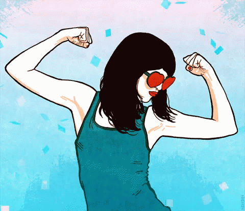 Animated drawing of a woman with heart-shaped glasses flexing her muscles, symbolizing strength.