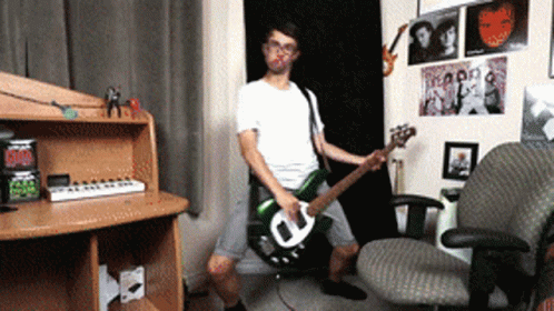 Stevie T (Steve Terreberry) intensely playing a green bass guitar in a room with band posters.