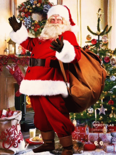 Santa Claus arrives, standing by a festive Christmas tree with a sack of gifts and a 'Merry Christmas' bag.