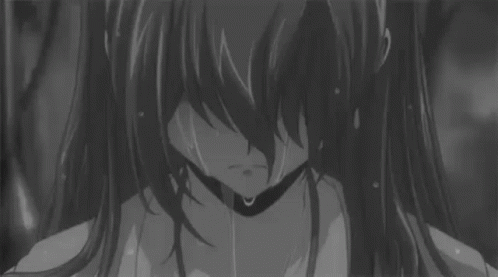 Anime girl with closed eyes, tears streaming down her face in a melancholic black and white scene, evoking a stillesque mood.
