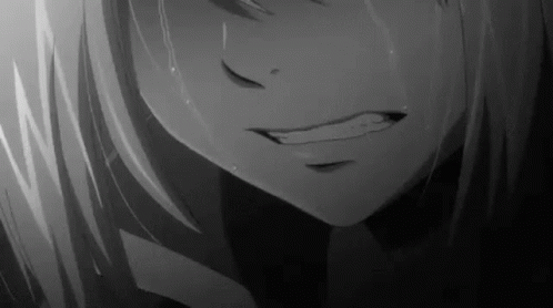 Stillesque, an anime girl, is shown crying with tears streaming down her face in a poignant black and white scene.