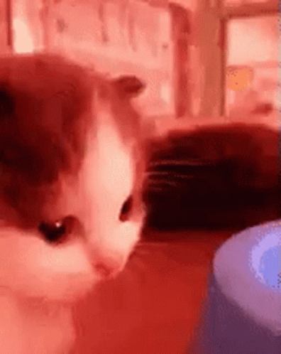 Adorable kitten with wide eyes stares intently at a blue object in a red-hued room.
