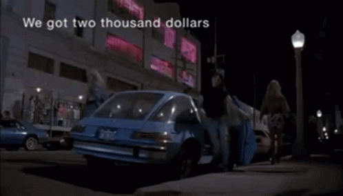 A scene from Waynes World where characters celebrate getting two thousand dollars, possibly a stimulus check.
