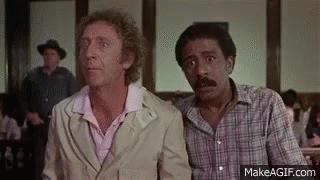 Two men, one with curly hair and another with a mustache, react with wide-eyed surprise.