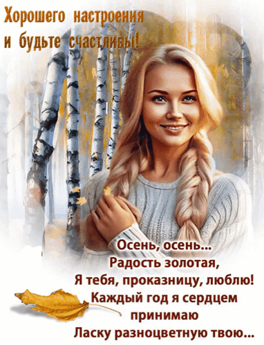 A beautiful woman with braided hair smiles in an autumn setting with birch trees, accompanied by warm Russian poetry.