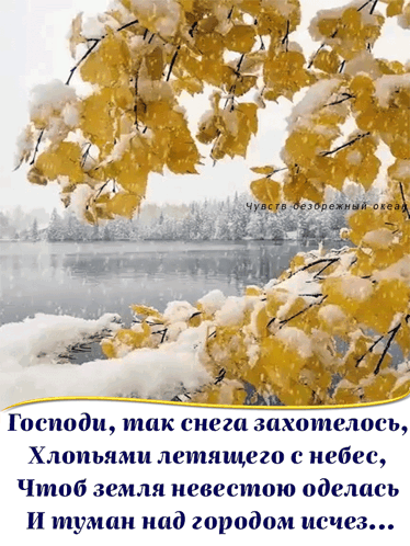 A beautiful winter landscape with yellow leaves covered in snow, accompanied by a Russian poem expressing a longing for snow.