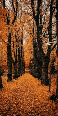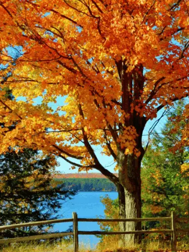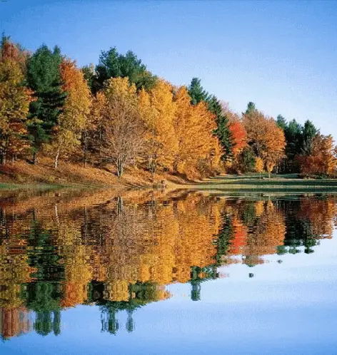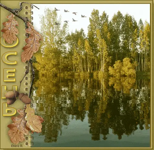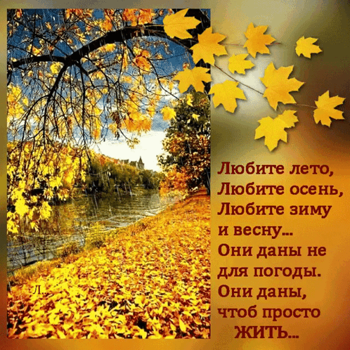 An autumn landscape with golden leaves and a river, accompanied by a Russian poem about loving all seasons for life.