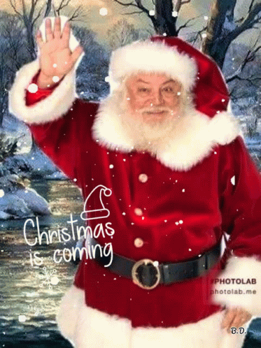 Santa Claus waves as snow falls, with the text 'Christmas is coming' on a festive background.