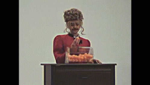 Anton Lapenko in character, wearing a wig and mustache, holds up a bingo ball with the number 21.