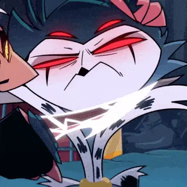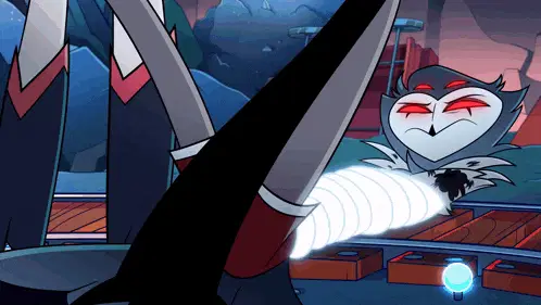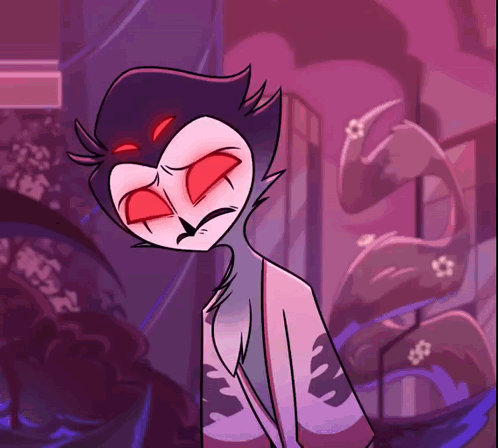 a cartoon character with red eyes is standing in front of a building .