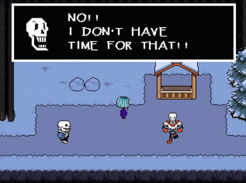 Papyrus from Undertale stomps his foot and exclaims "NO!! I DON'T HAVE TIME FOR THAT!!" in a snowy area.