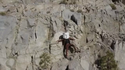 A person wearing a distinctive stone head helmet precariously clings to a steep, rocky cliff face.