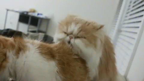 Two fluffy cats grooming each other, with one cat looking grumpy at the camera.