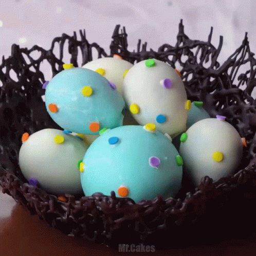 Stop-motion animation of colorful Easter eggs and cute chicks in a chocolate nest, decorated with sprinkles.