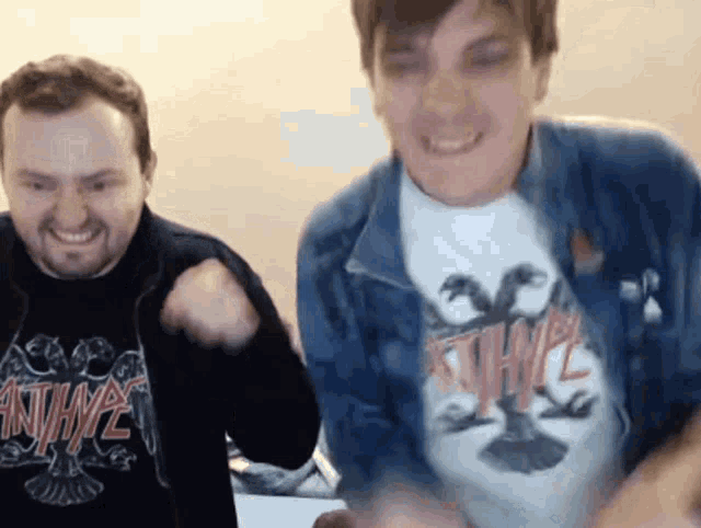 Замай and Слава КПСС energetically move, one wearing a Slayer shirt, in a lively moment.