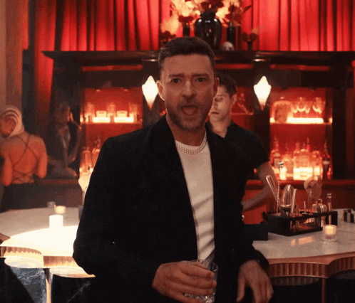 Justin Timberlake in a stylish bar, wearing a black blazer and pearl necklace, holding a drink.