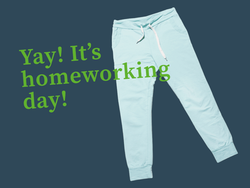 Light blue sweatpants with 'Yay! It's homeworking day!' text, perfect for a cozy home office.