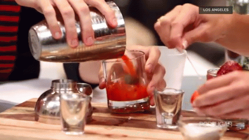Crafting a vibrant strawberry basil gin cocktail, garnished with a sugar-coated strawberry in Los Angeles.