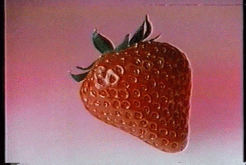 A strawberry displayed with a retro VHS aesthetic on a pink background.