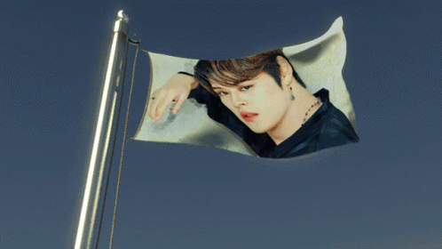 A flag featuring K-pop idol Lee Know from Stray Kids (SKZ) waves against a clear blue sky.