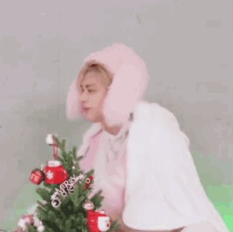Stray Kids member Hyunjin, wearing a cute pink bunny outfit, accidentally drops a Christmas ornament while decorating a small tree.