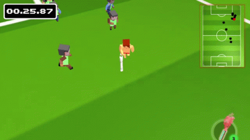 A pixelated character runs across a green soccer field in a streaker-themed video game, avoiding opponents.