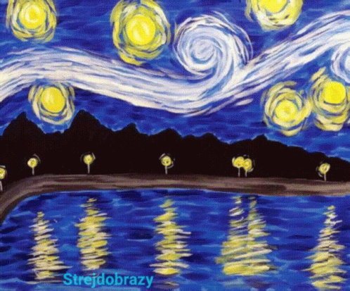 A vibrant painting by Strejdobrazy, inspired by Van Gogh's Starry Night, featuring a swirling night sky.