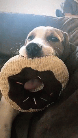 Strelin, a cute dog, holds a donut-shaped toy in its mouth with its tongue playfully sticking out.