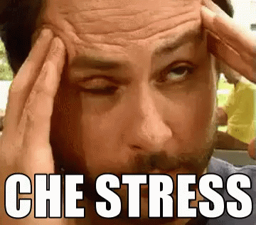 Man holding his head in pain with 'CHE STRESS' text overlay, expressing extreme frustration.
