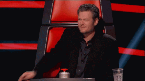 Blake Shelton looks stressed while sitting in his red coach's chair on The Voice, hands clasped in front of him.