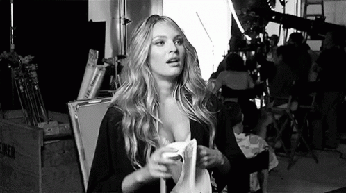 A model playfully puts a bra on her head in a black and white backstage scene, perhaps expressing a moment of stress or humor.