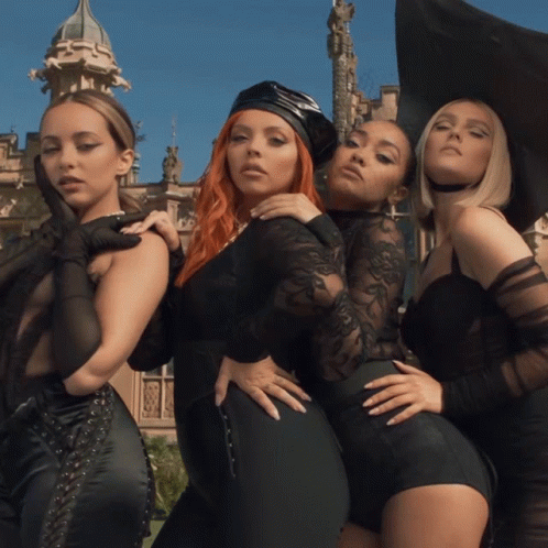 Jesy Nelson, Jade Thirlwall, Leigh Anne Pinnock, and Perrie Edwards of Little Mix strike fierce poses in front of a grand building.
