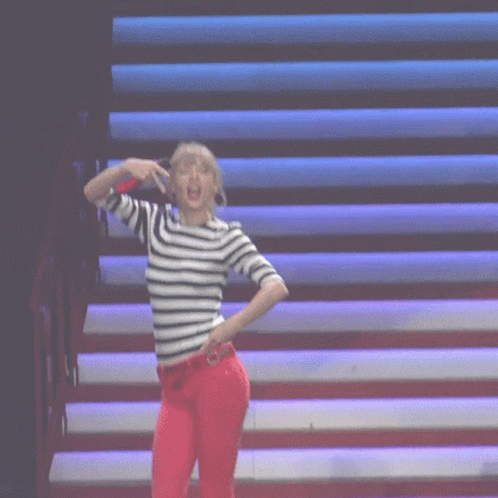 Taylor Swift dances on stage, wearing a striped shirt and red pants, making peace signs.