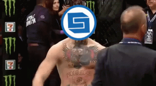 A fighter, possibly Conor McGregor, in a boxing ring with a blue logo covering his face, referencing Strong Meme Strong Node.