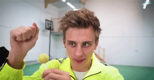 Young man in a neon yellow jacket intently holding a lollipop, seemingly preparing for a candy challenge.